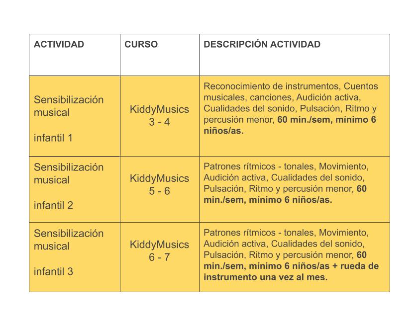“KiddyMusics en tu escuela” da la posibilidad a los centros educativos de llevar a cabo las actividades, en horario lectivo o extraescolar, basadas en el programa KiddyMusics, una clase semanal concebida con parte de la formación musical a través del juego introduciendo a los niños en el mundo de la música. Nuestro programa se basa en focalizar y reforzar 5 conceptos principales:
